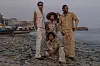 Designerne Cephas Mensah, Akua Ofosu, Okoko Traore og Nabecca Boatemaa (sittende foran) fra The Revival på stranden i Jamestown i Ghana.