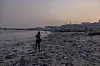 Barn leker blant søppel skylt opp av tidevannet på stranden ved Jamestown.