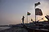 Okoko Traore ser utover havet fra en gammel fiskebåt på stranden i Jamestown