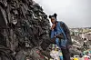 Han holder pusten mens han prøver å balansere på en haug av sammenknyttede tøyfiller, sprukne elektronikkdeler og engangsplast. Rundt ham ligger noen brukte skosåler, et par Replay-jeans og en Peppa Gris-veske i rød plastikk.