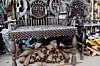 Kunstneren tar Bistandsaktuelt med på omvisning i den innholdsrike bakgården. Vi stopper ved en stor og svært dekorativ stol, som nærmest ser ut som en trone. Armlenene er laget av geværkolber. Stolsetet av pistoler. Og midt på stolryggen, som er laget av patronhylser, er det formet et slags ansikt med to øyne og en åpen munn.