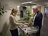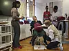Kommenterer en ansatt smilende mens han passerer. I et hjørne i gangen lener en kvinne seg tilbake i en fødestol, mens en jordmor og en assistent står ved siden av. De tre er helsearbeidere fra Finland, Nigeria og Nepal, og nå demonstrerer de for oss hvordan blødning etter fødsel kan kontrolleres gjennom massasje av magen. Rødt «blod» drypper ned på gulvet.