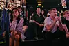 To fingre slenges opp i været som i et peacetegn. En annen hever begge armene i været, med sprikede fingre. Noen veksler penger seg imellom, mens andre står med hendene i kors.