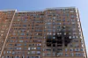 Senere samme dag oppsøker vi en av høyblokkene i utkanten av byen, som ble utsatt for et angrep 28. juni i år. Et stort svart hull midt på den 19 etasjer høye bygningen vitner om det som skjedde. To mennesker ble drept under drone-angrepet, ifølge myndighetene.