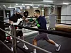 Han som «presser» heter Elie Nehme og er NRK-korrespondentens faste boksetrener. Nå skal de inn i ringen. Treneren fester puter til kroppen. Bokseren strammer hanskene.
