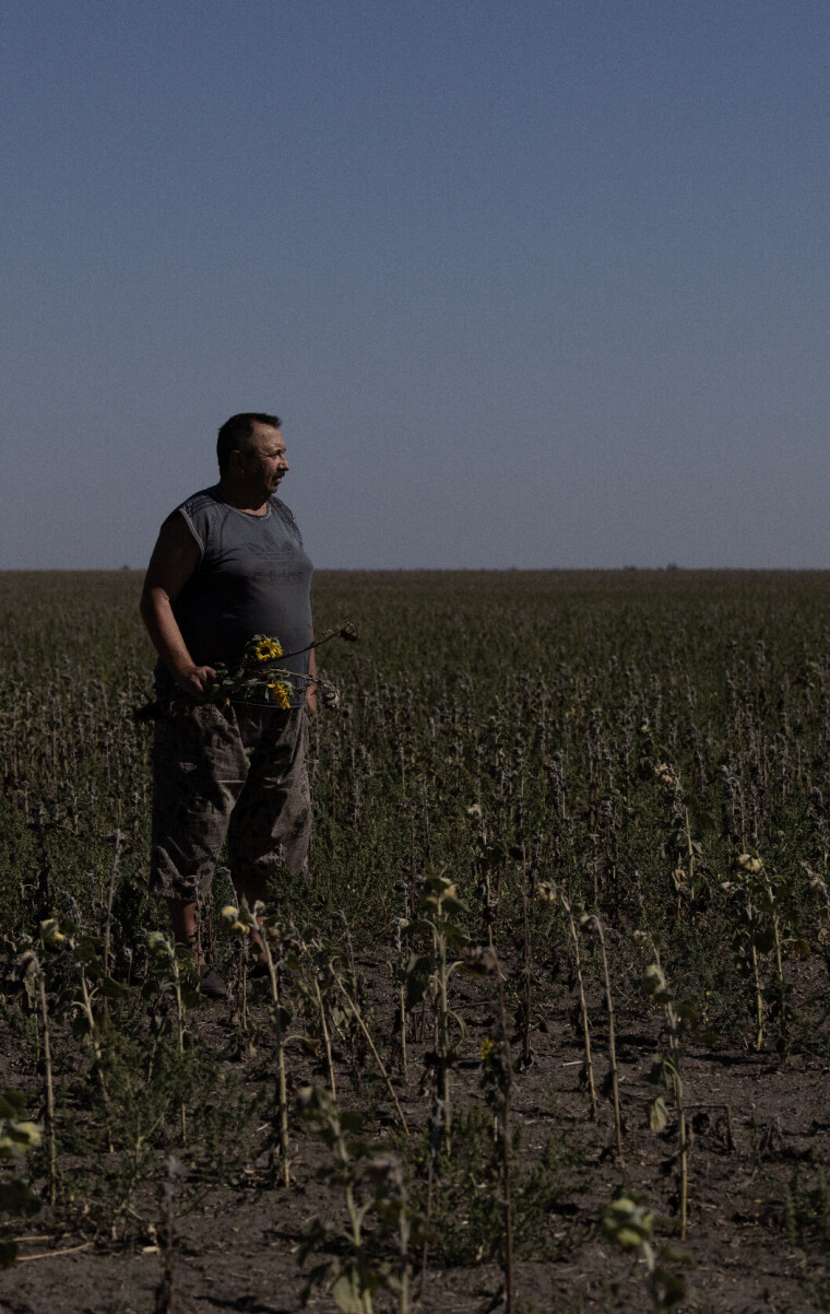 Han står midt i det enorme jordbrukslandskapet, ikke langt fra huset sitt, og forteller at det er første gang at solsikkene her, om lag tre mil fra frontlinjen, bare blir stående.