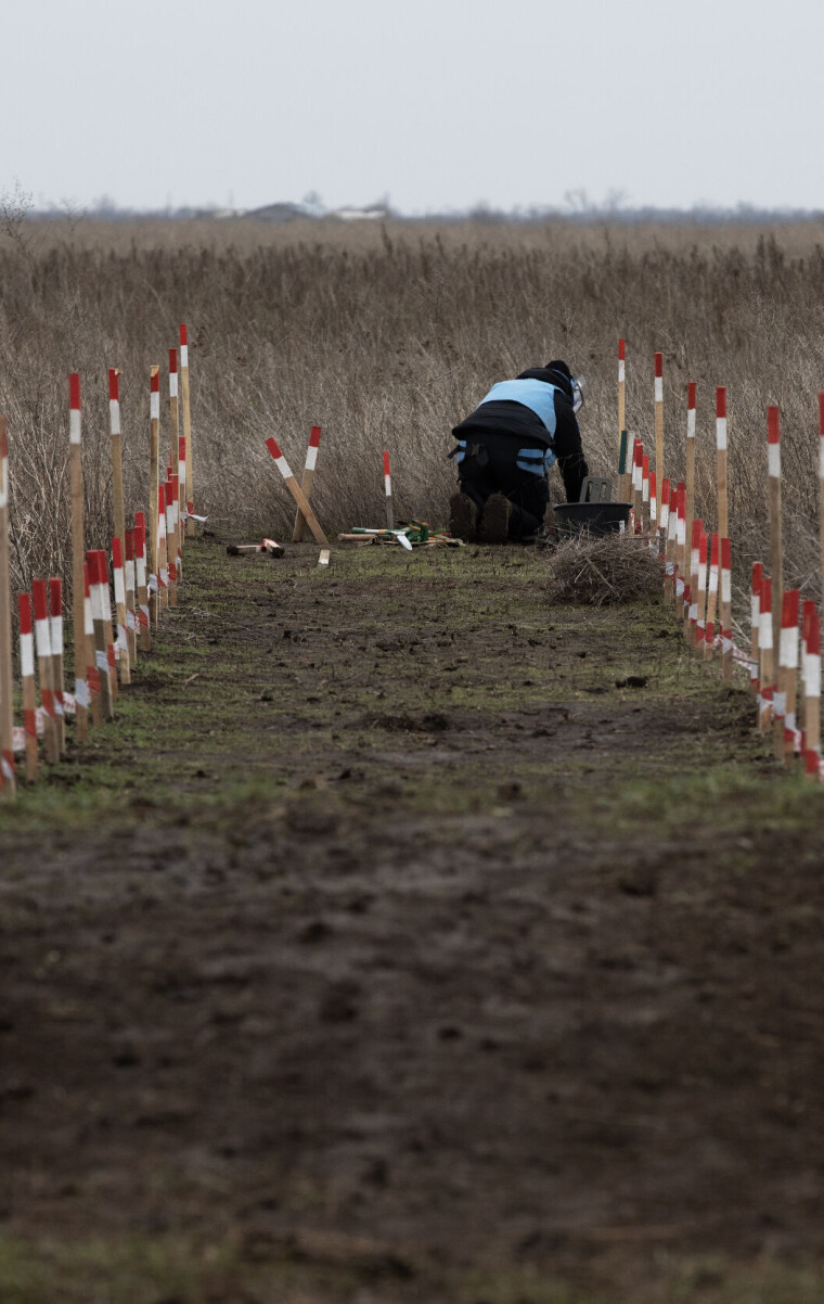 Mens Flyktninghjelpen jobbet med å sette inn nye dører og vinduer, eller takbjelker for å reparere ødelagte tak, jobbet Norsk Folkehjelps mineryddere med å renske åkrene rundt Liubomyrivka for udetonerte eksplosiver og miner. En enorm jobb.