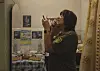Hun stryker hånden over et fotografi av en glad ung mann, med solbriller og skjeggstubber. Ved siden av står flere bilder, diplomer, porselensengler, en bukett plastikkblomster.